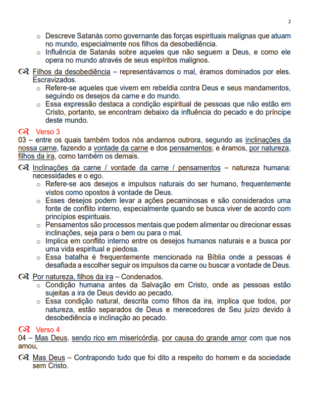 Apresenta-se a salvação pela graça mediante a fé em Cristo Jesus, ressaltando, antes da fé, que os crentes estavam mortos em seus pecados e transgressões, seguindo o curso deste mundo e do príncipe das potestades do ar.
